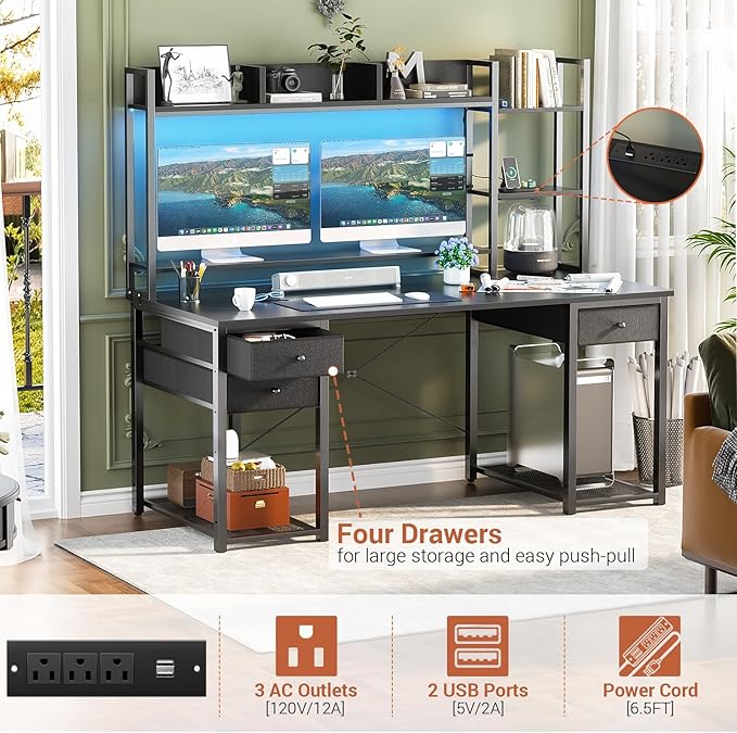 Aheaplus Desk with LED and Outlets, Gaming Desk with Hutch, 55.2'' Computer Desk with Drawers, Reversible Office Desk with Storage Bookshelf Large Workstation Desk with Shelf, Desk for Home, Black